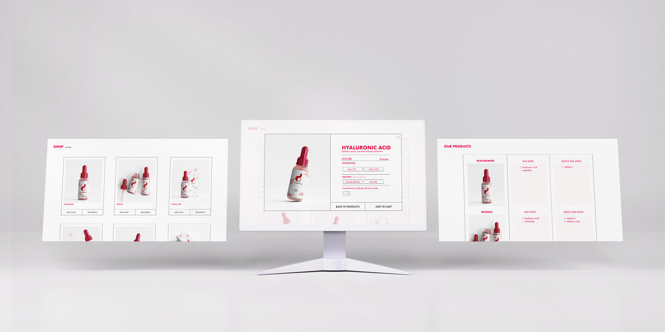 Dewdrop's brand identity combines soft, blush pink hues with elegant line art illustrations to create a modern and trendy aesthetic that conveys a sense of trust, simplicity, and empowerment in the skincare industry.